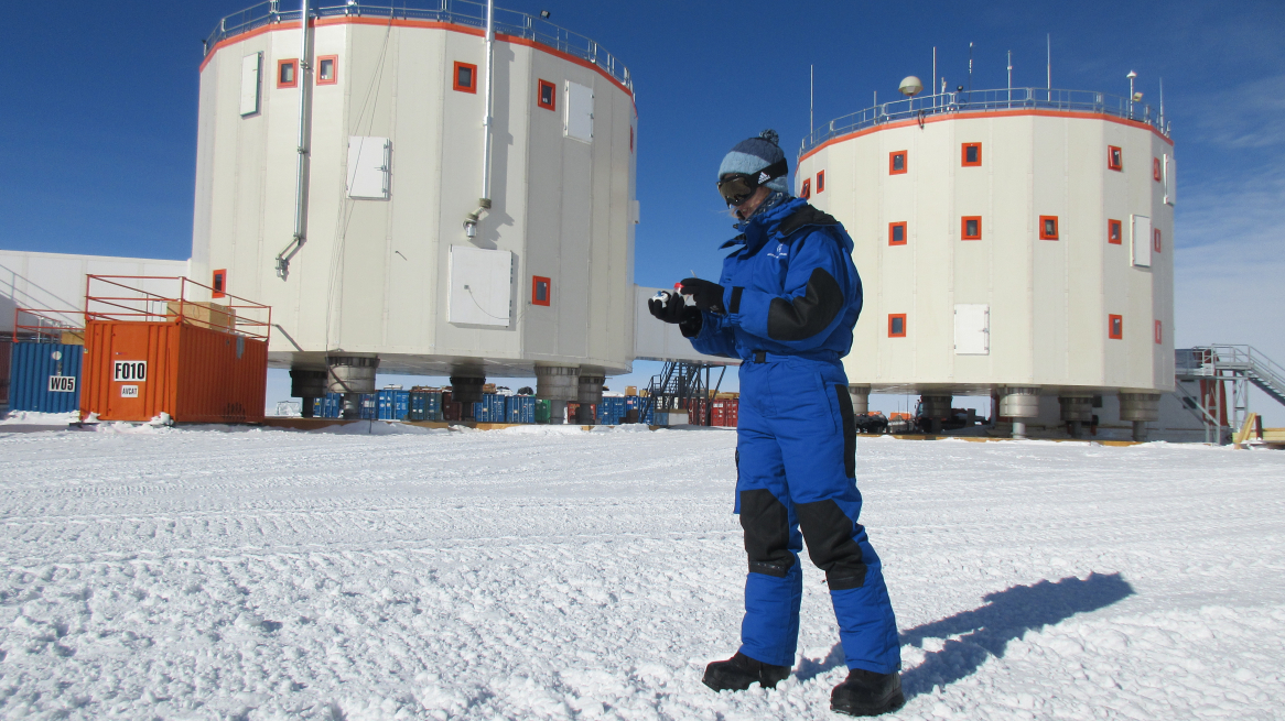 Carmen Possnig analizando la nieve frente a la estación de investigación del Polo Sur. ©Cyprien Verseux PNRA:IPEV