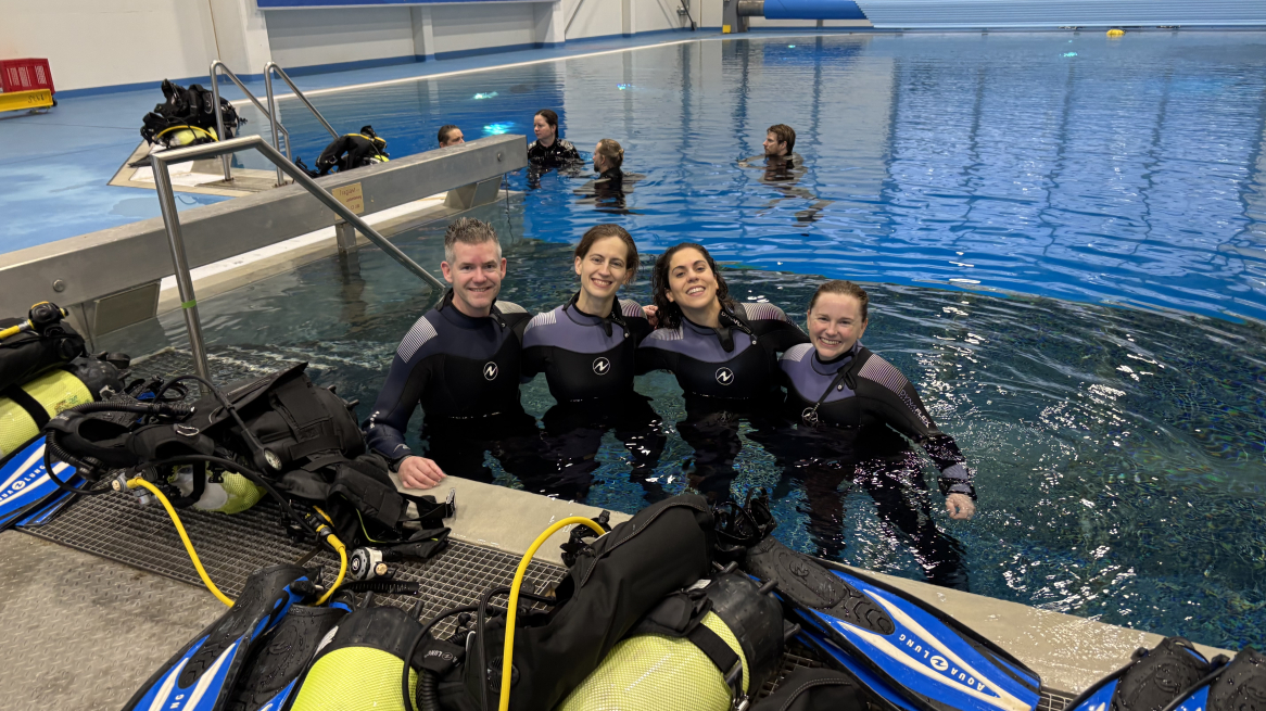 Entrenamiento de ingravidez en la enorme piscina de la ESA, Carmen Possnig 2ª por la izquierda © ESA