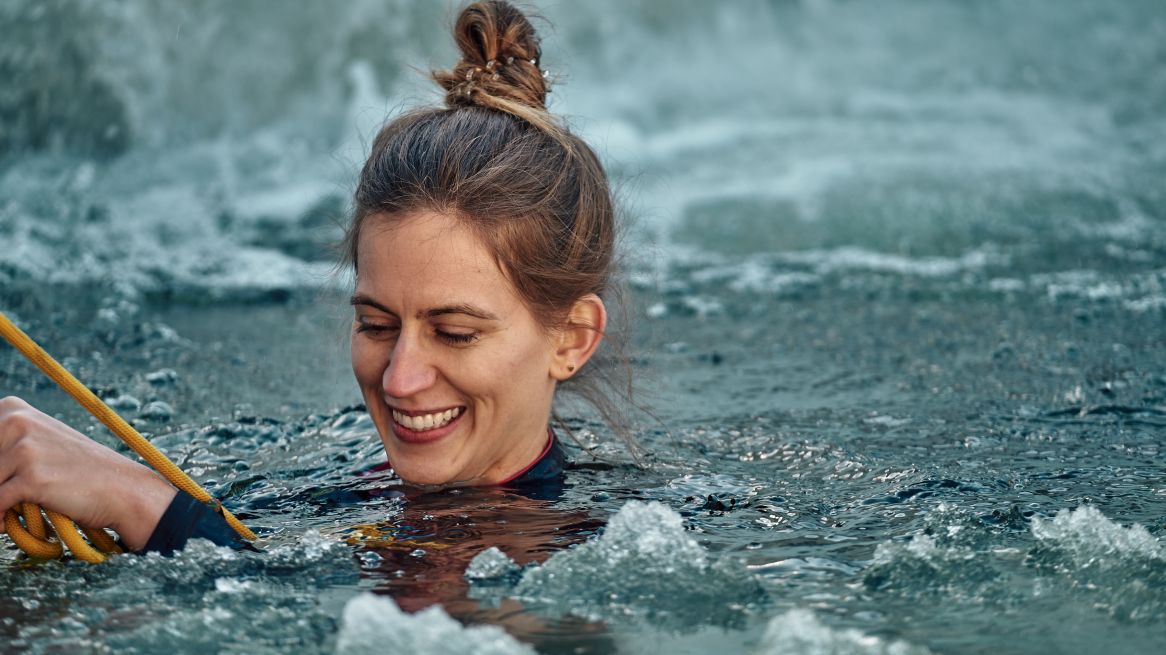 Para Carmen Possnig, un chapuzón en agua helada forma parte del proceso de convertirse en astronauta. © Trailhaven - S. Schraegle