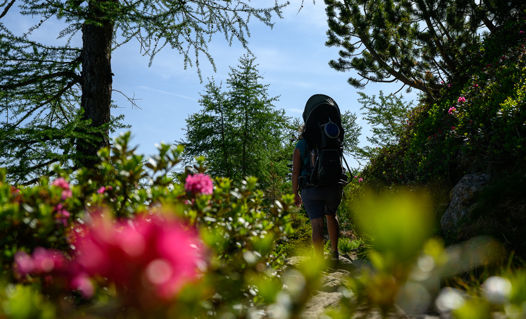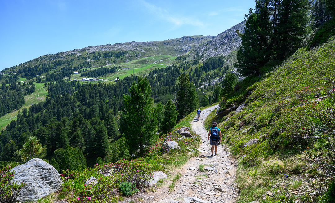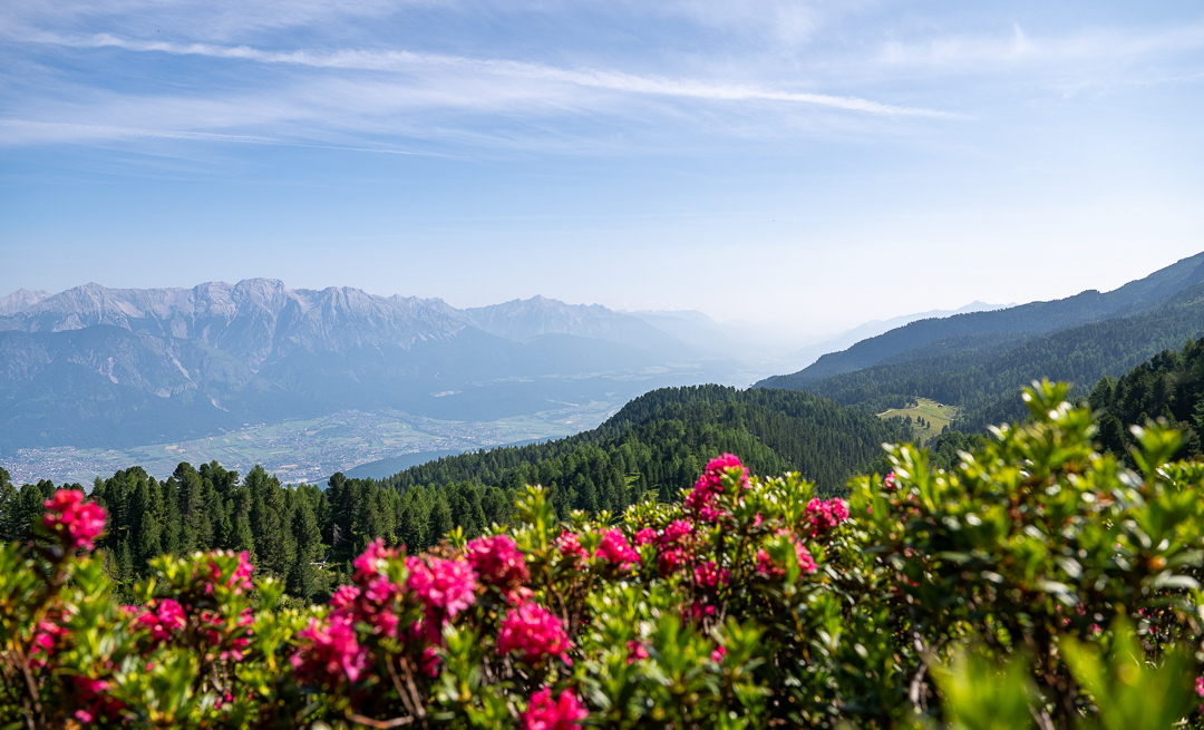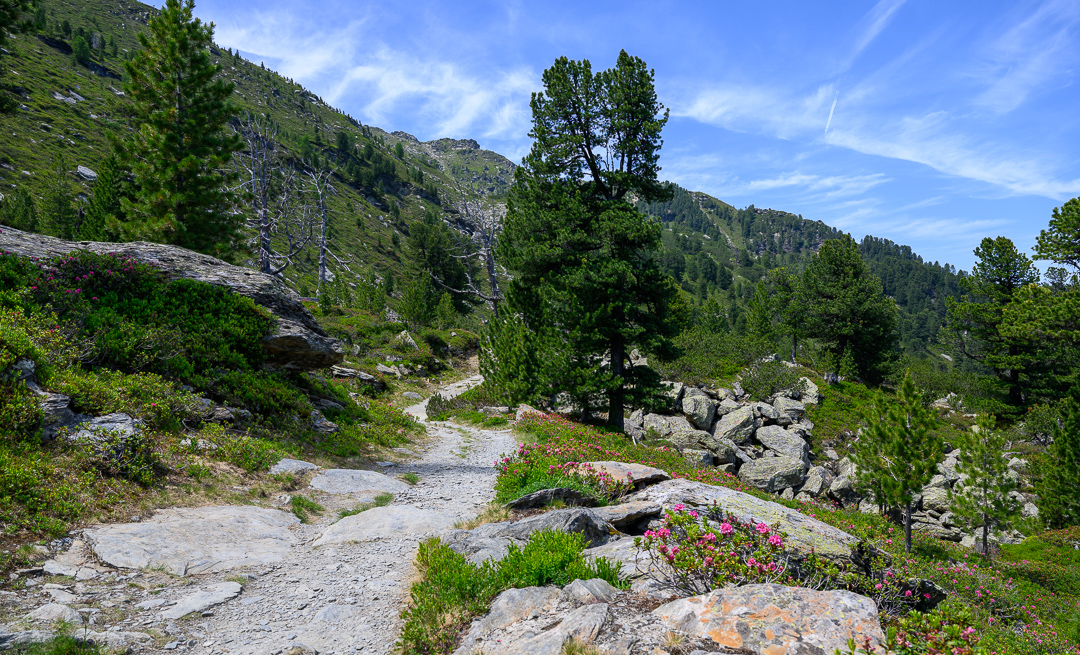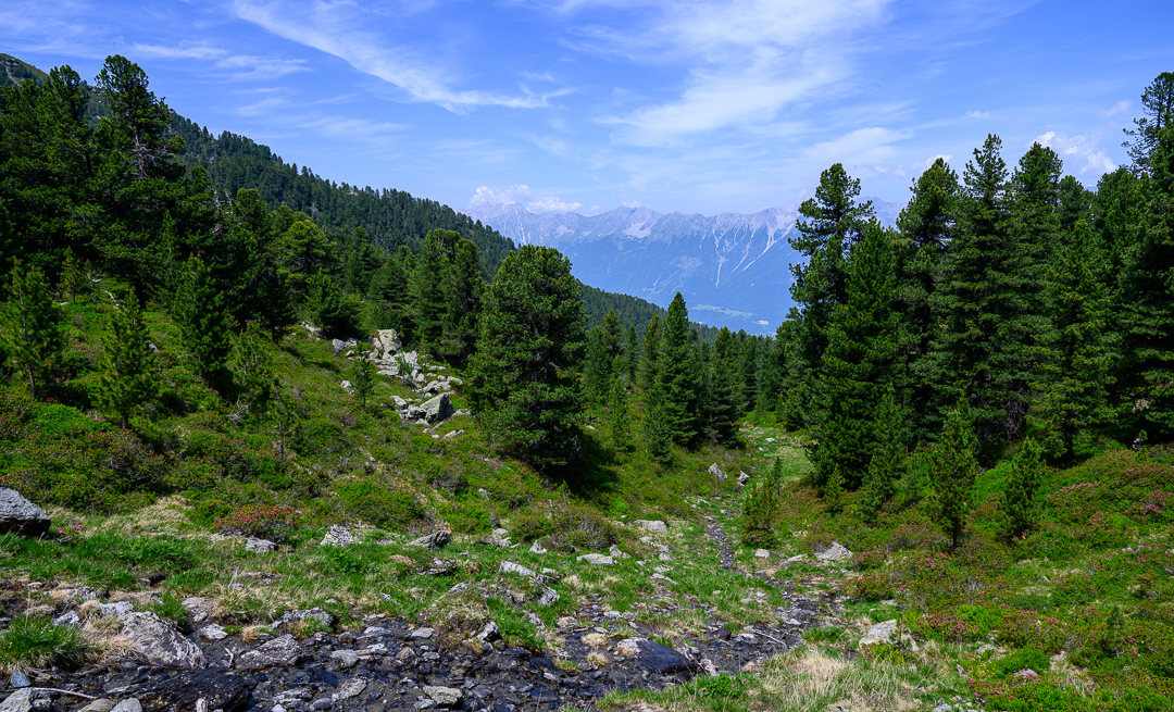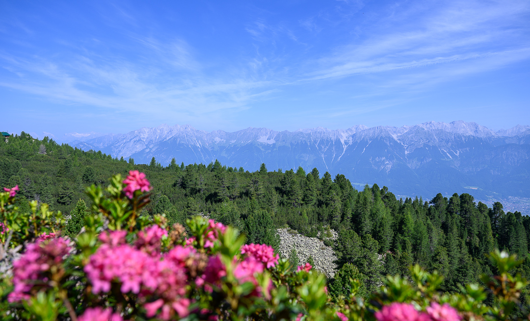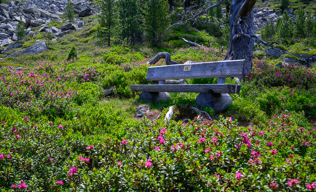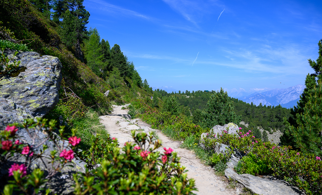 Desde allí, el sendero sube y baja suavemente por la arboleda hasta el Tulfeinalm, sin grandes desniveles. El Zirbenweg se encuentra a unos 2.000 metros sobre el nivel del mar y está enclavado en un magnífico telón de fondo natural. Las áreas de descanso a lo largo del camino invitan a detenerse, con maravillosas vistas del valle del Inn. Dependiendo del tiempo, la ruta es fácilmente accesible entre junio y octubre. Se recomienda especialmente el mes de julio, cuando las rosas alpinas están en plena floración y el paisaje resplandece de vivos colores.