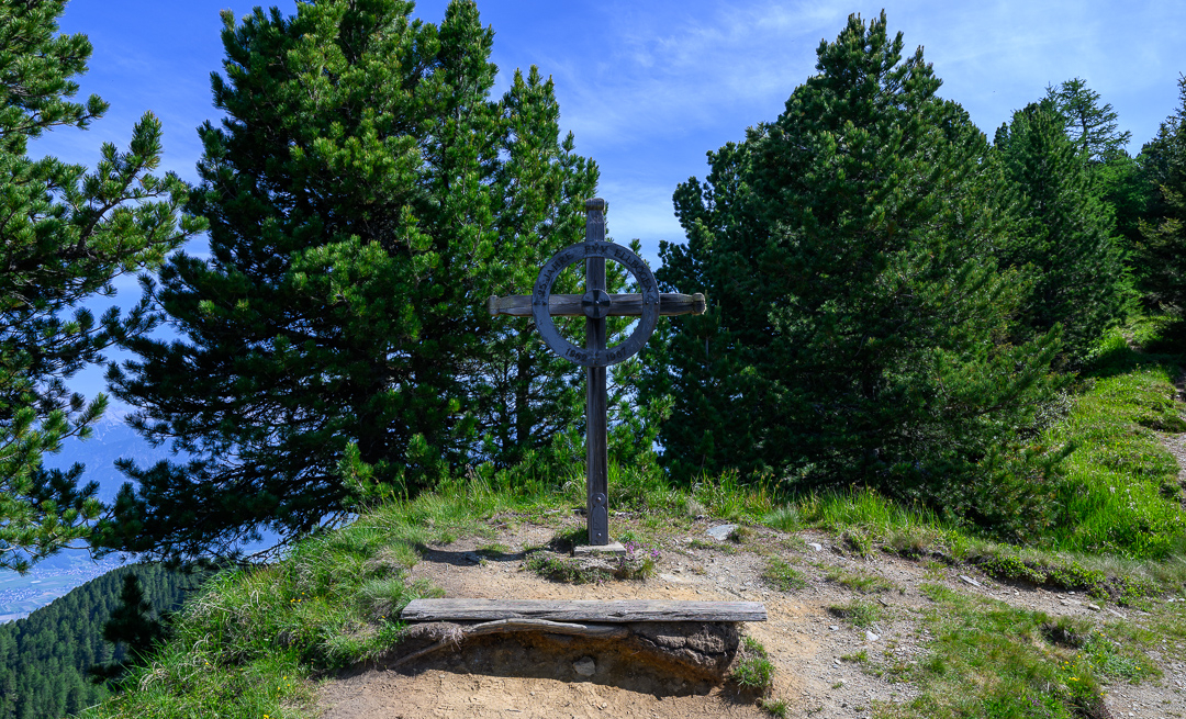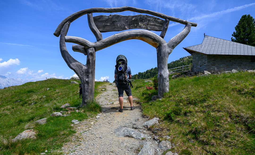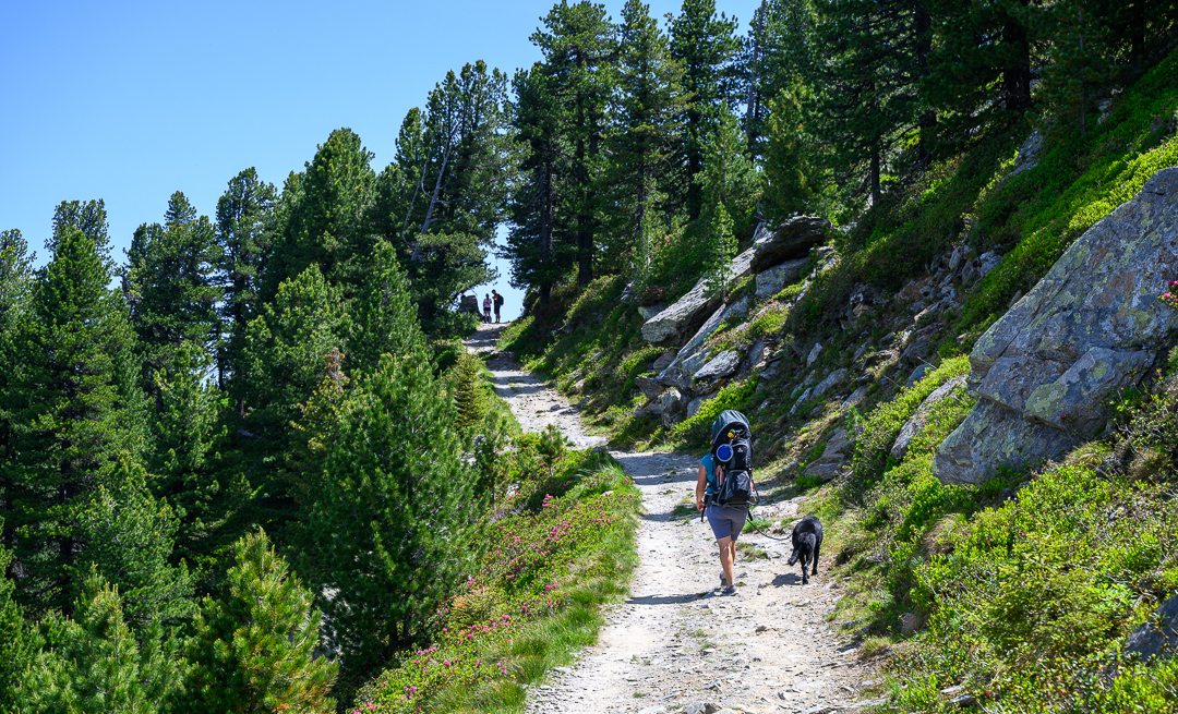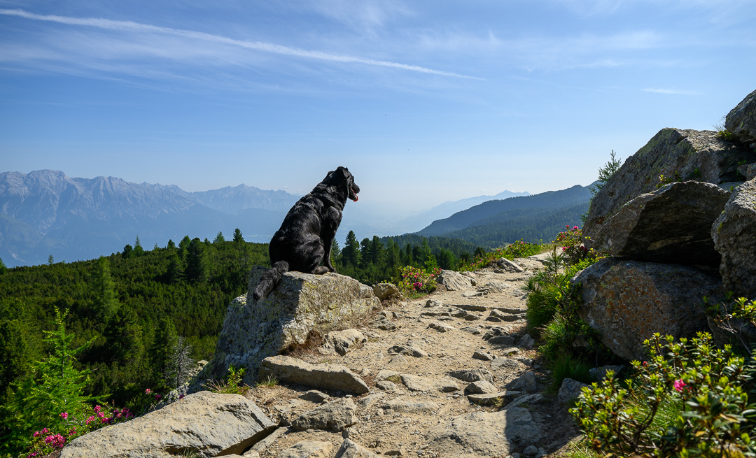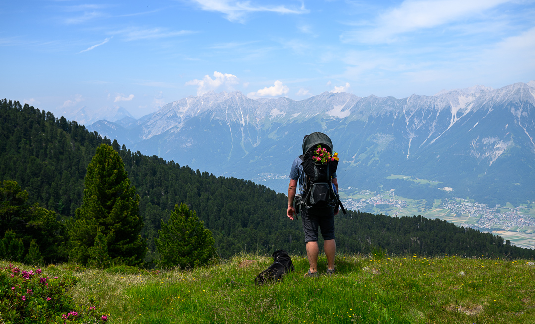 Comenzamos nuestra excursión familiar por la mañana con un cómodo viaje en telecabina hasta la estación de montaña del Patscherkofel. Salimos directamente desde allí, con el Kraxe a la espalda y llenos de ilusión por la aventura con un excelente panorama. El sendero Zirbenweg es perfecto para pequeños exploradores, grandes amantes de la naturaleza y también para nuestros compañeros de cuatro patas. Un ancho sendero nos lleva junto a fragantes pinos piñoneros suizos, a través de idílicos prados alpinos hasta la acogedora Boschebenhütte, que nos invita a tomarnos un merecido descanso. Cerca de la cabaña hay una cruz de madera, uno de los muchos y hermosos lugares para hacer fotos a lo largo del camino.