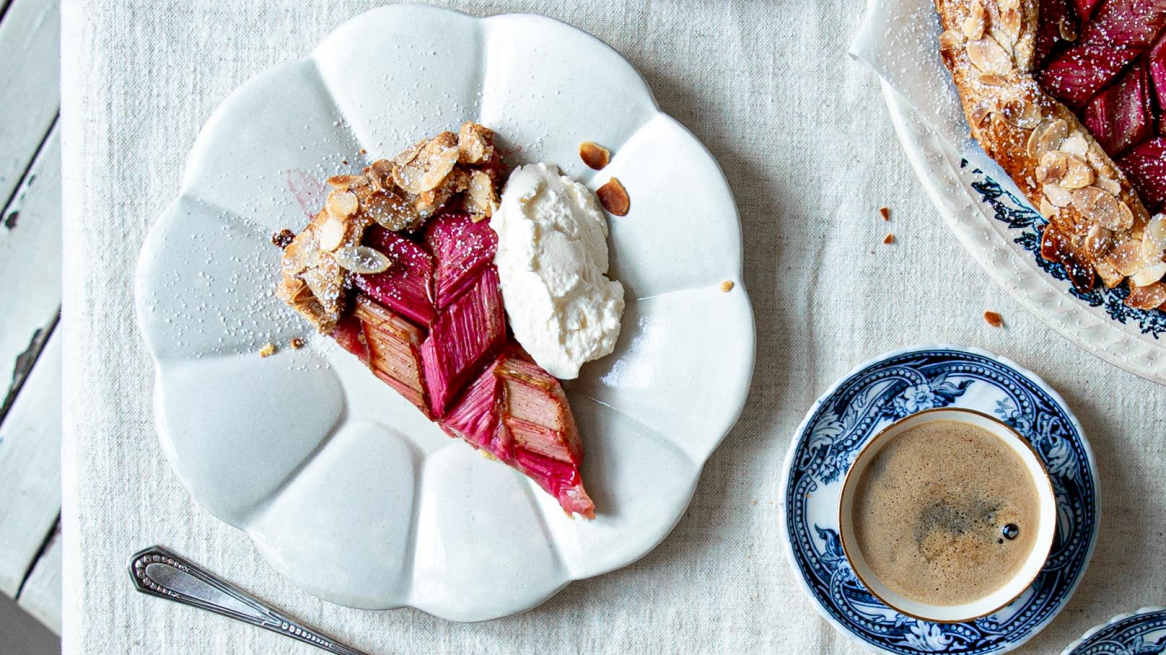 Si vous êtes motivé, vous pouvez disposer les morceaux de rhubarbe en losange au centre de la galette en laissant environ quatre centimètres de libre sur le bord. Rabattez ensuite le bord sur les morceaux de rhubarbe et étalez un peu de crème fouettée dessus. Enfin, saupoudrez le tout d'amandes effilées et d'un peu de sucre.