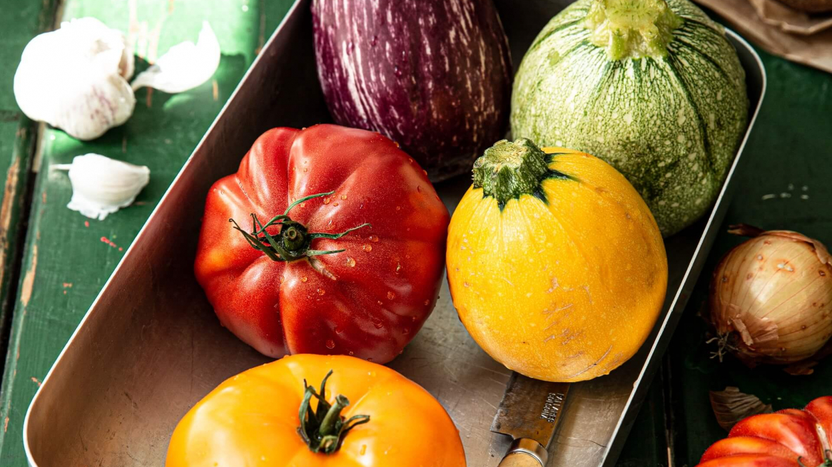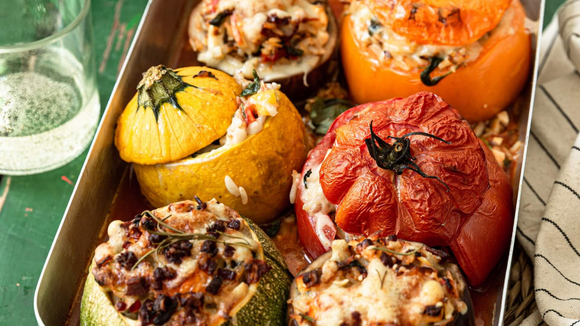 Laver et nettoyer les tomates, les courgettes et les melanzani. Couper les chapeaux des tomates et des courgettes, retirer la chair à l'aide d'une cuillère et la mettre de côté. Couper les melanzani en deux et les évider également à l'aide d'une cuillère. Si tu utilises des courgettes normales de forme allongée, fais comme pour les melanzani.