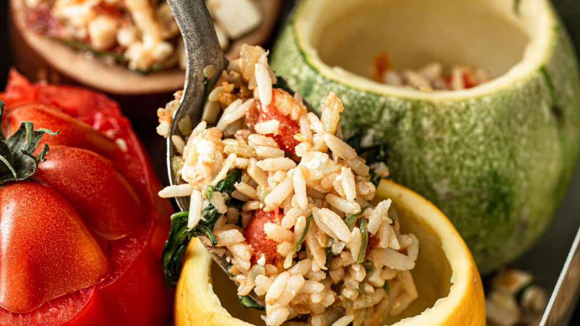 Hacher finement l'oignon et les gousses d'ail et les faire revenir dans un peu d'huile d'olive jusqu'à ce qu'ils deviennent transparents. Nettoyer les champignons, les couper en petits morceaux et les faire revenir à feu vif avec la chair hachée des courgettes et des melanzani pendant environ 5 minutes. Couper également les tomates séchées en petits morceaux et les ajouter dans la poêle avec les épinards et la pulpe de tomate. Émietter la feta, hacher finement les herbes et en ajouter deux tiers aux légumes. Ajoutez le riz et assaisonnez le tout avec du sel et du poivre.