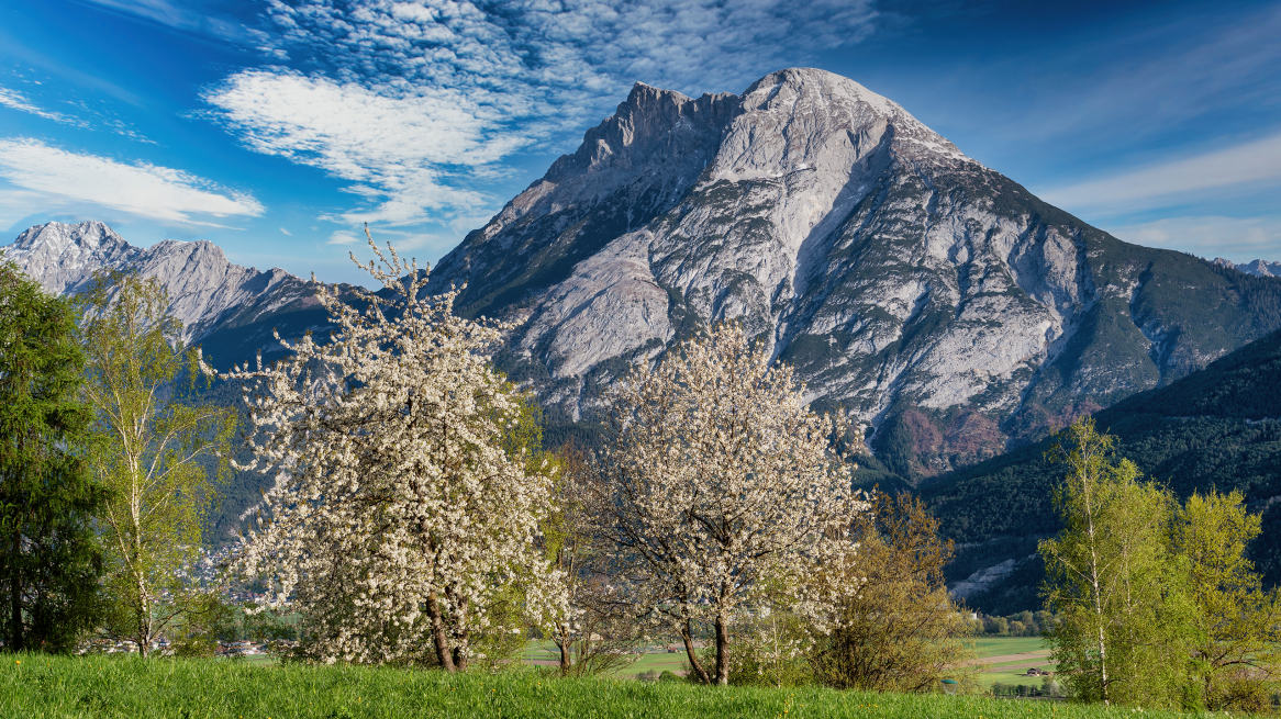 Sans oublier ma commune d'origine Flaurling. Lorsque les cerisiers et les pommiers y sont en fleurs et que, en arrière-plan, les Hohe Munde et les Mieminger Kette se dressent, c'est un spectacle que j'aimerais photographier à nouveau chaque année. C'est ce mélange d'idylle rurale et de décor naturel impressionnant qui fait pour moi le printemps au Tyrol.