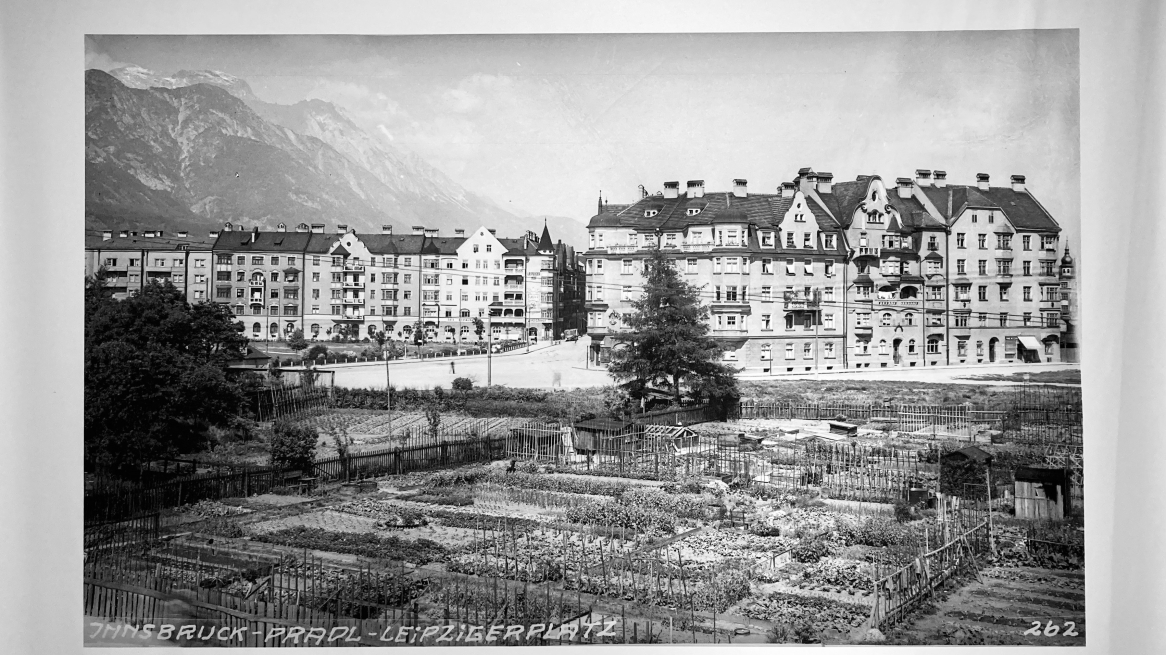 Veduta di Leipziger Platz a Pradl con il Leipziger Hof sullo sfondo e gli orti in primo piano