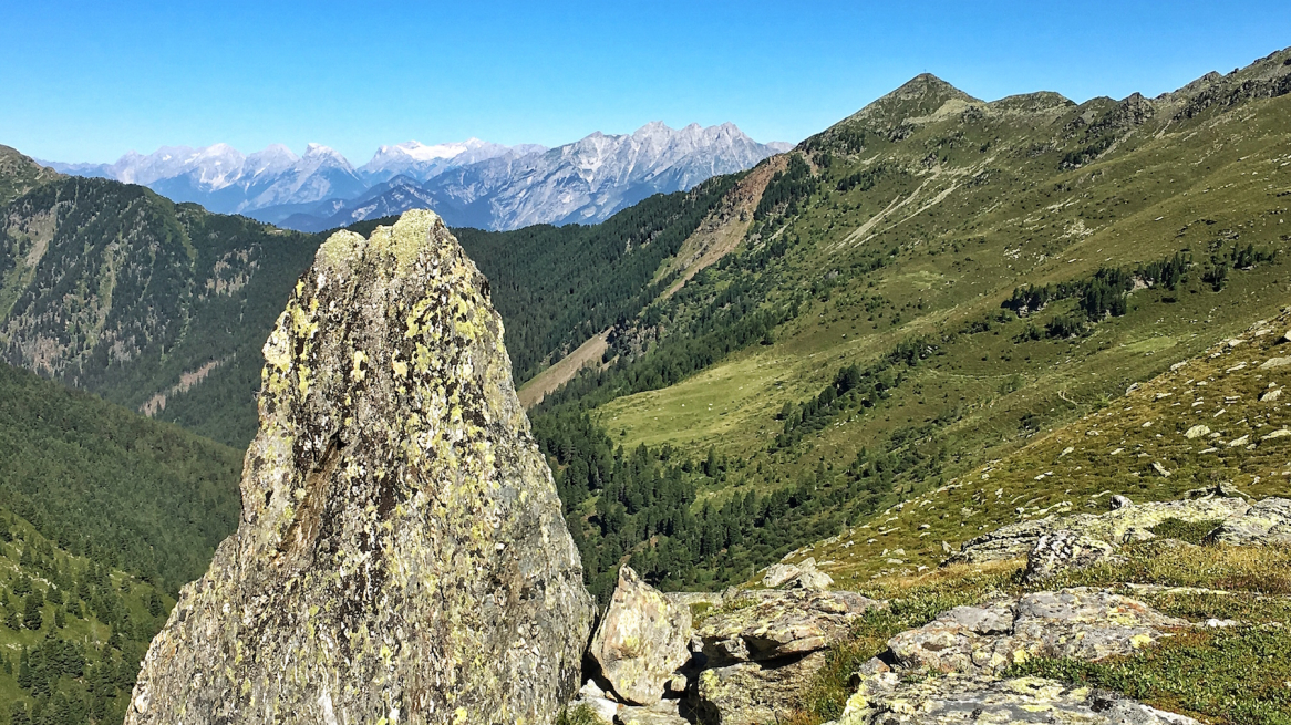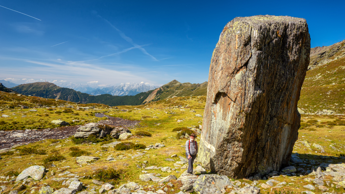 Questo menhir, visibile da lontano, affianca la B'schriebene Stoa. Da qui è ben visibile la meravigliosa Viggarspitze, dominatrice della valle Viggartal.