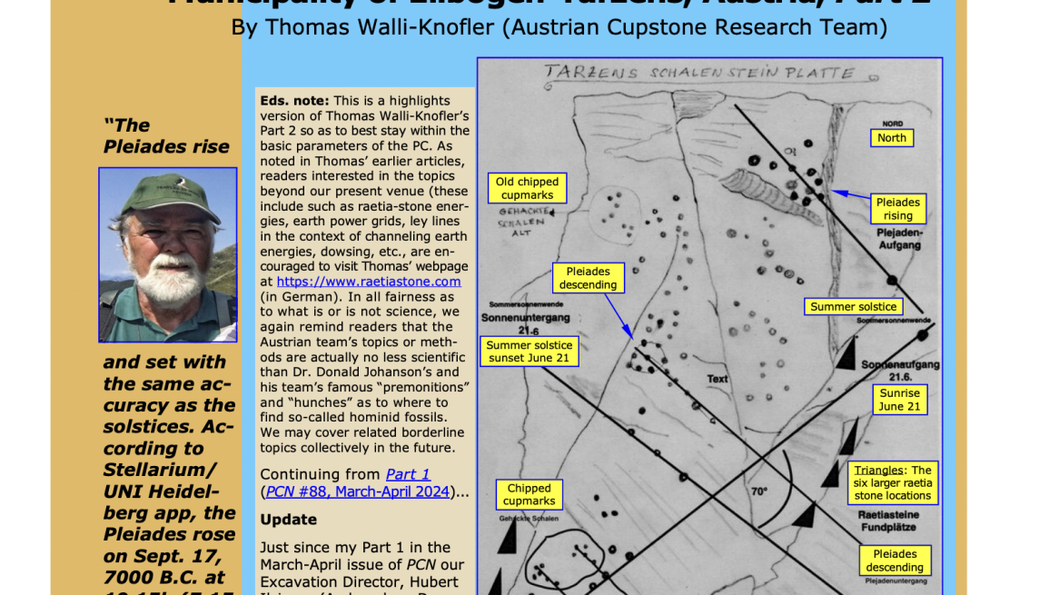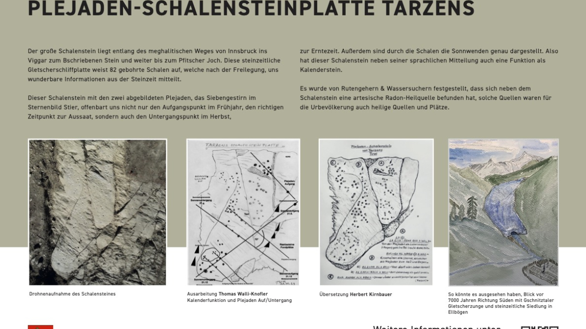 Tarzens Ellbögen Lo scavo archeologico di un'enorme pietra a scodella ha prodotto un risultato molto interessante. Per chi non avesse mai sentito parlare di pietre a scodella: si tratta di pietre che presentano delle depressioni emisferiche (scodelle) su una superficie per lo più liscia, create artificialmente. Mentre l'archeologia scientifica ha costantemente evitato un'interpretazione di queste pietre per decenni, un gruppo di ricerca tirolese, di cui faccio parte anch'io, offre una soluzione logica ma quasi fantastica al mistero secolare. Tarzens I risultati degli scavi confermano in modo impressionante che una scrittura rudimentale era già in uso nell'Età della Pietra. E che la comunità preistorica aveva già conoscenze astronomiche molto sviluppate.