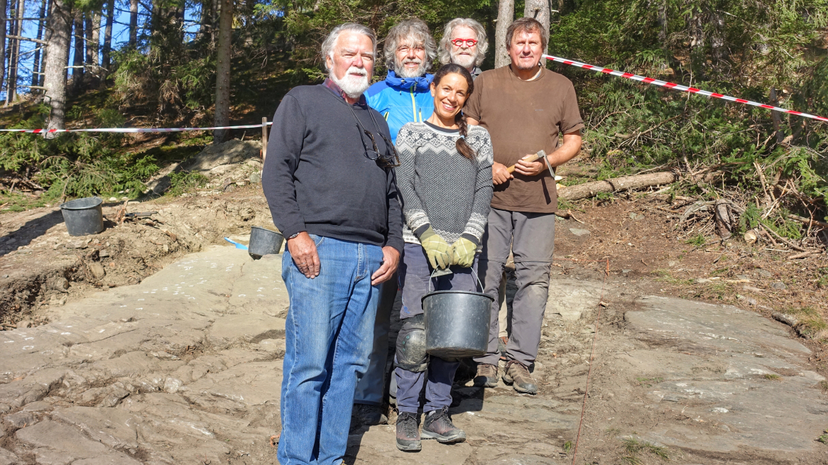 Il gruppo di ricerca, che lavora gratuitamente, ha anche organizzato e realizzato lo spettacolare scavo di Ellbögen. Da sinistra a destra: Thomas Walli-Knofler, Josef Öfner, Belinda Reinhart, Werner Kräutler. Il direttore degli scavi era il dottor Bert Ilsinger, nella foto a destra. Immagine: Thomas Walli-Knofler