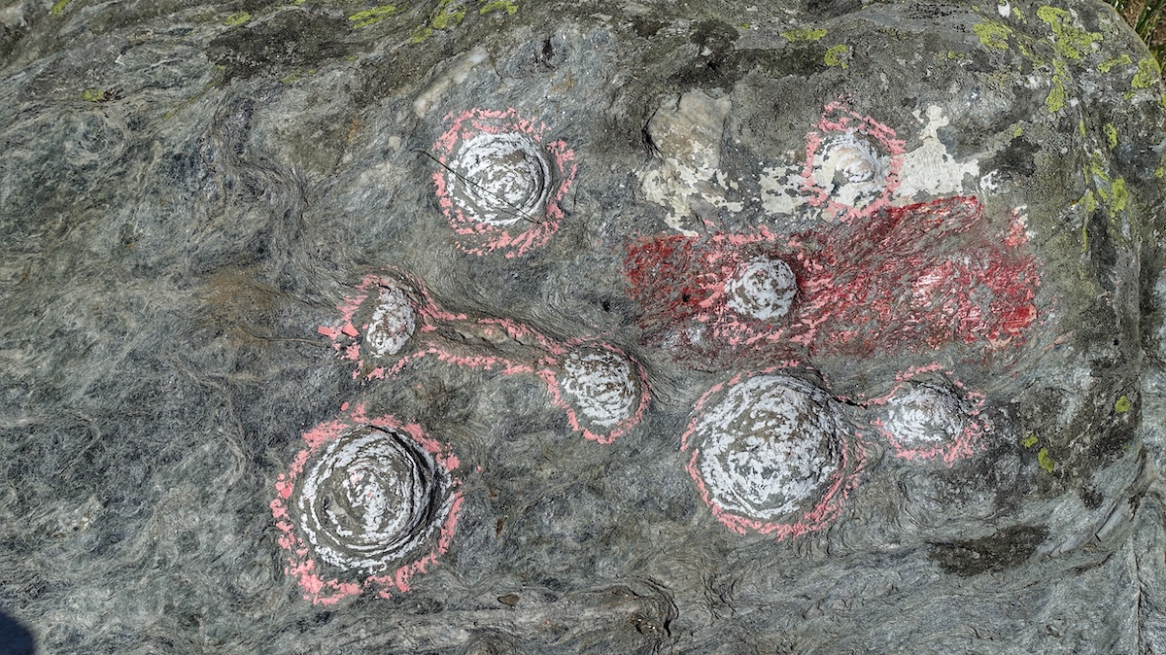 Un sasso di conchiglia sul prato dell'Iss, sulla Oberlegerweg, nella valle di Viggartal. Il colore è stato utilizzato dal gruppo di ricerca per rendere riconoscibili le conchiglie. Immagine: Kräutler