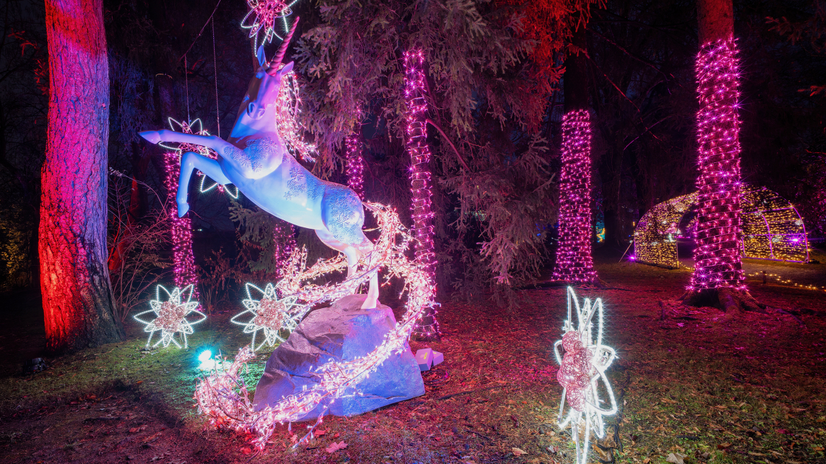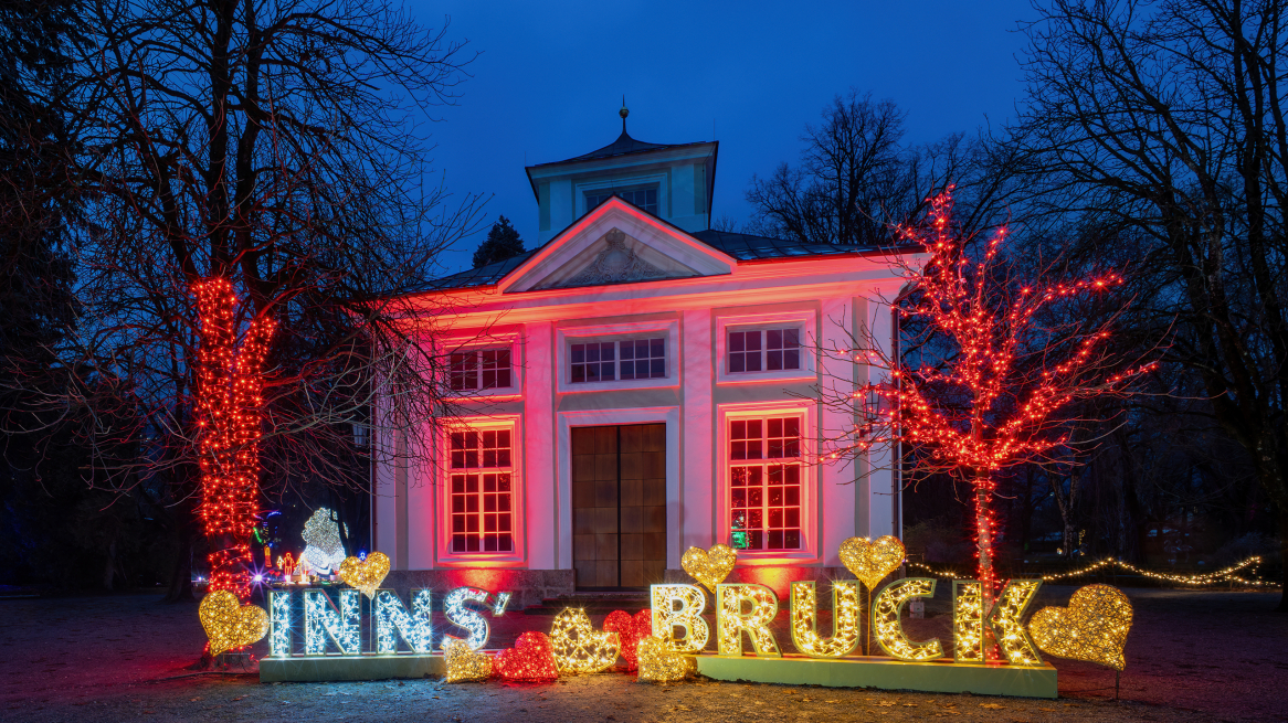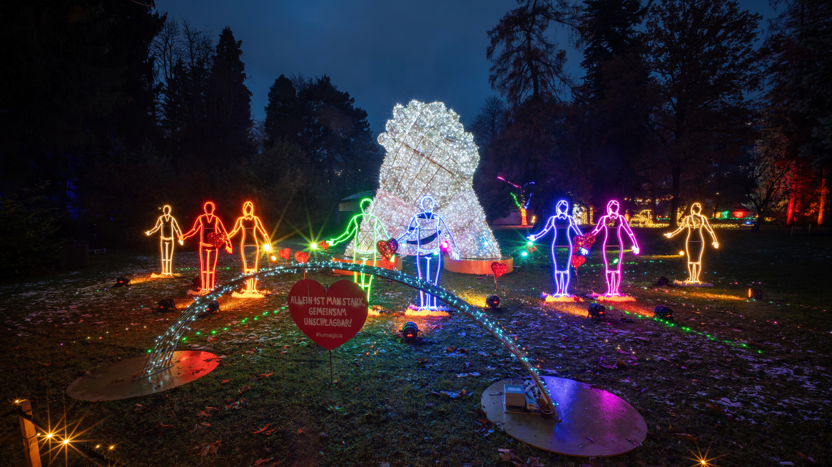 Lumagica Appena entrati nell'Hofgarten, si viene accolti da un affascinante mare di luci che trasforma l'oasi verde di Innsbruck in un parco magico, ricco di sculture luminose e installazioni luminose artistiche. „Peace, Love, Family“ All'insegna del motto , il tour vi porta attraverso vari mondi tematici. Ogni angolo riserva nuove sorprese: da animali maestosi e piante colorate a mistiche creature mitiche.