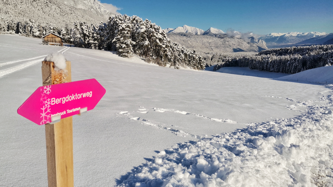 All'inizio ero un po' deluso, perché non vedevo l'ora di fare un'escursione nella foresta invernale da favola con questo tempo da sogno, seguita da una corsa in slittino. Ma beh, siamo flessibili e così abbiamo cambiato rapidamente i nostri piani. Di sfuggita, ho notato il cartello color magenta "Bergdoktorweg"segno". I sentieri escursionistici sull'altopiano di Mieminger sono generalmente ben segnalati, con cartelli color magenta che indicano i sentieri speciali per le escursioni invernali.