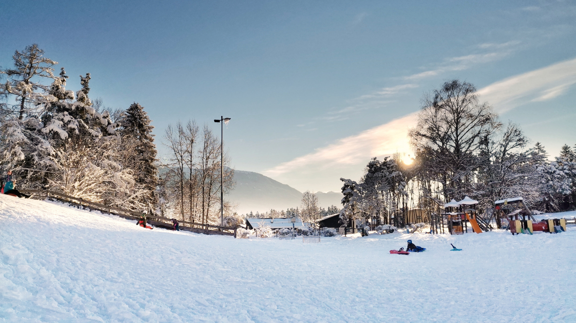 Quindi non è stato un problema che mio marito e i bambini abbiano accorciato la passeggiata. Posso rassicurare tutti quelli che pensavano che i miei poveri uomini dovessero aspettare in macchina al freddo fino a quando la mamma ha finalmente finito la sua passeggiata. Tutt'altro! I ragazzi si sono divertiti molto sulla collina dello slittino. Consiglio alle famiglie di iniziare l'escursione qui e non al punto di partenza ufficiale del "Bergdoktorweg" (a proposito, potete trovare le indicazioni esatte qui). "Solo" andare a fare una passeggiata può essere noioso per alcuni bambini. Almeno per i miei, che sono felici quando c'è un po' più di azione.