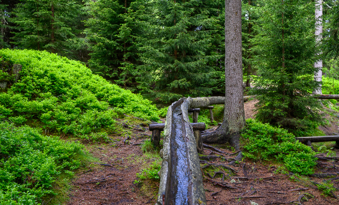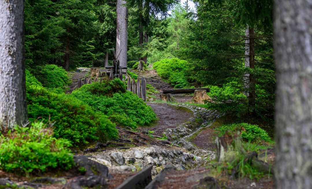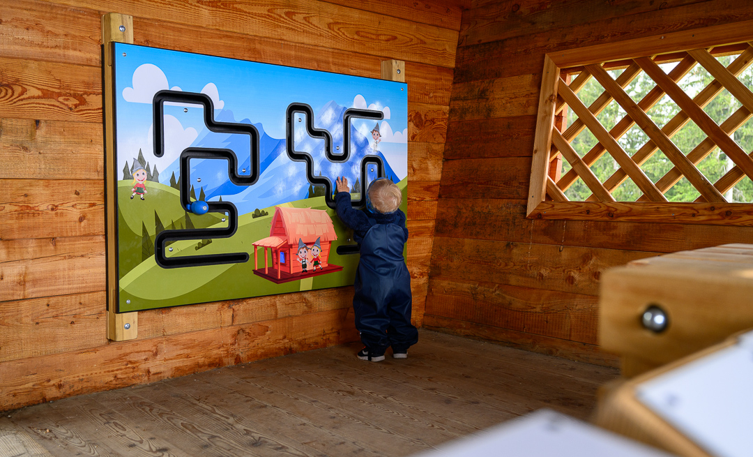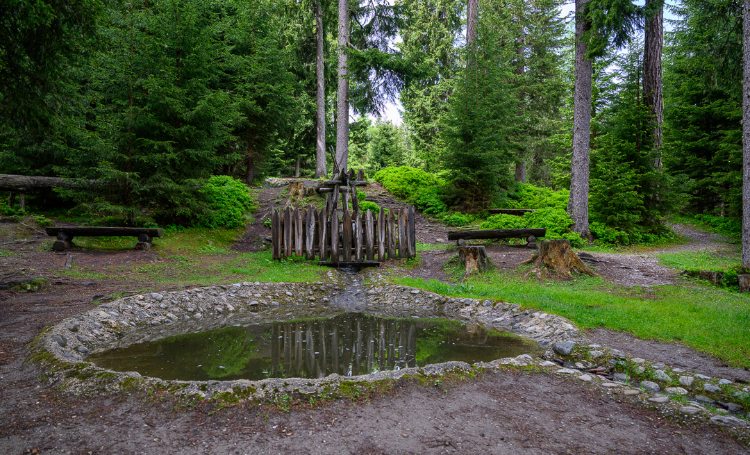 Het magische water biedt veel verfrissing, vooral in de zomermaanden. Er is een waterpark voor kinderen midden in het bos. Hier kunnen kleine ontdekkingsreizigers het water indammen en weer openen. Volg het water langs de houten kanalen en kijk hoe het door waterraderen stroomt en eindigt in kleine vijvers. Aan het einde van het water staat een groot speelhuis van zand. Dit is het laagste punt van de schattenjacht en je loopt ongeveer tien minuten bergopwaarts naar de volgende speeltuin.